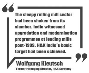 Markan, whose only experience of rolling mill operations was at Mukand’s modern wire rod mill, was astonished at the obsolete equipment and technology prevalent in the secondary rolling mills in India. A god-sent opportunity came his way through a 1983 chance meeting with Wolfgang Kluestch, Managing Director of Hoestemberghe & Kluetsch Gmbh, Germany, in the lobby of Oberoi Hotel, Mumbai.