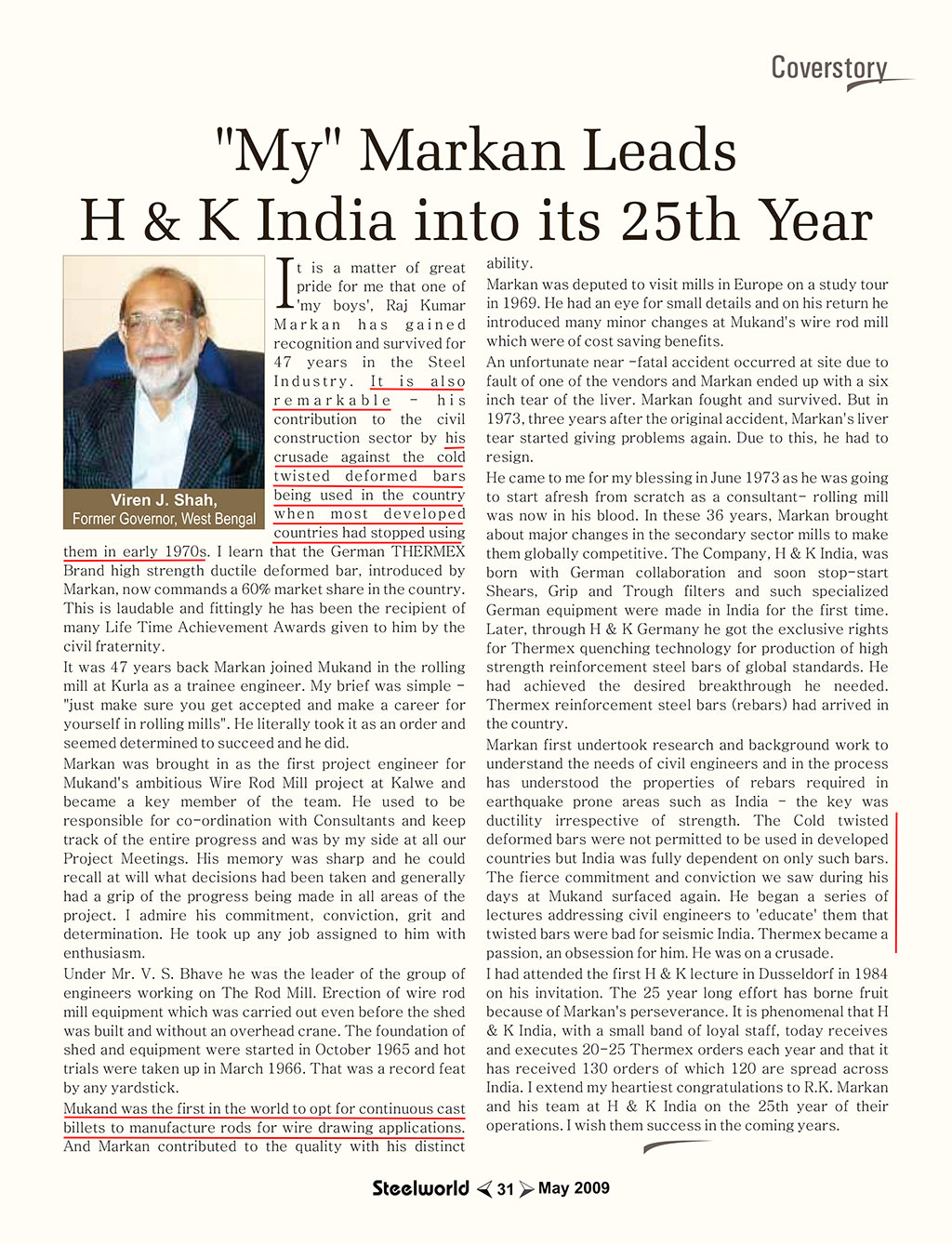 It is remarkable – his contribution to the civil construction sector by his crusade against the cold twisted deformed bars being used in the country when most developed countries had stopped using them in early 1970s. I learn that the German THERMEX Brand high strength ductile deformed bar, introduced by Markan, now commands a formidable market share in the country.